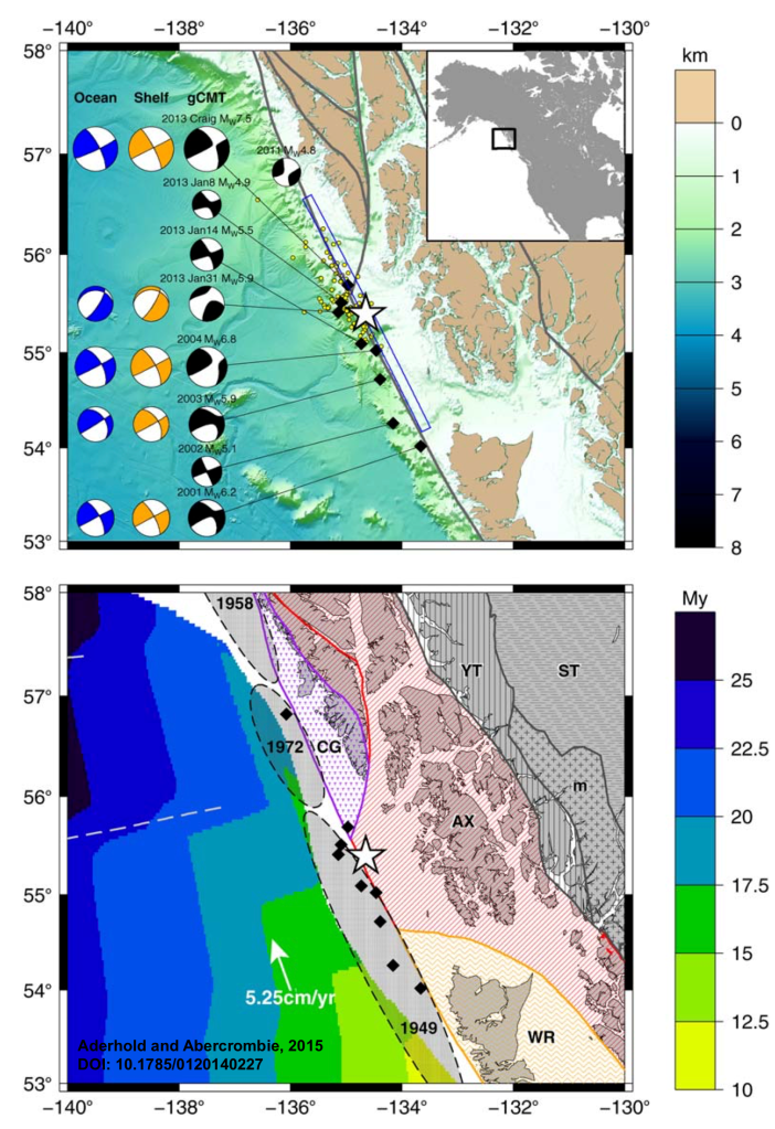 Aderhold, K., & Abercrombie, R. E. (2015). Seismic Rupture on an Oceanic–Continental Plate Boundary: Strike‐Slip Earthquakes along the Queen Charlotte–Fairweather Fault. Bulletin of the Seismological Society of America, 105(2B), 1129-1142. (ResearchGate, PDF)